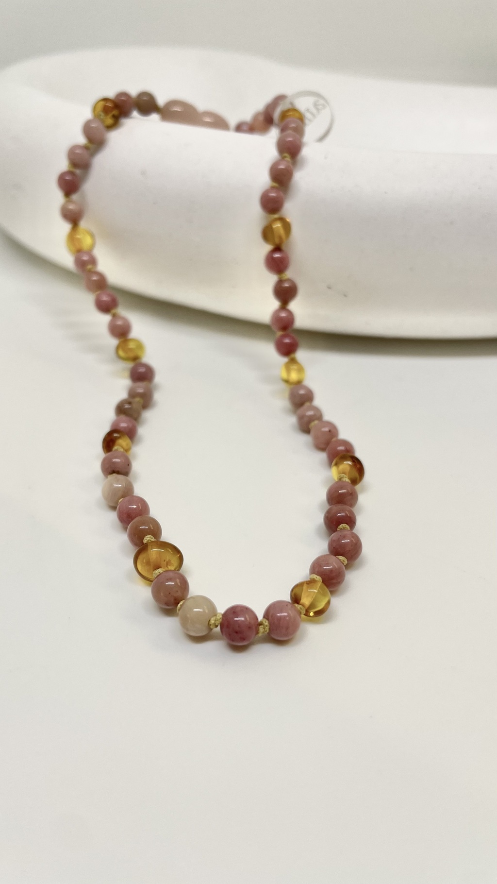 Collar de ambar con mini cognac y con mini piedras de rodonita.